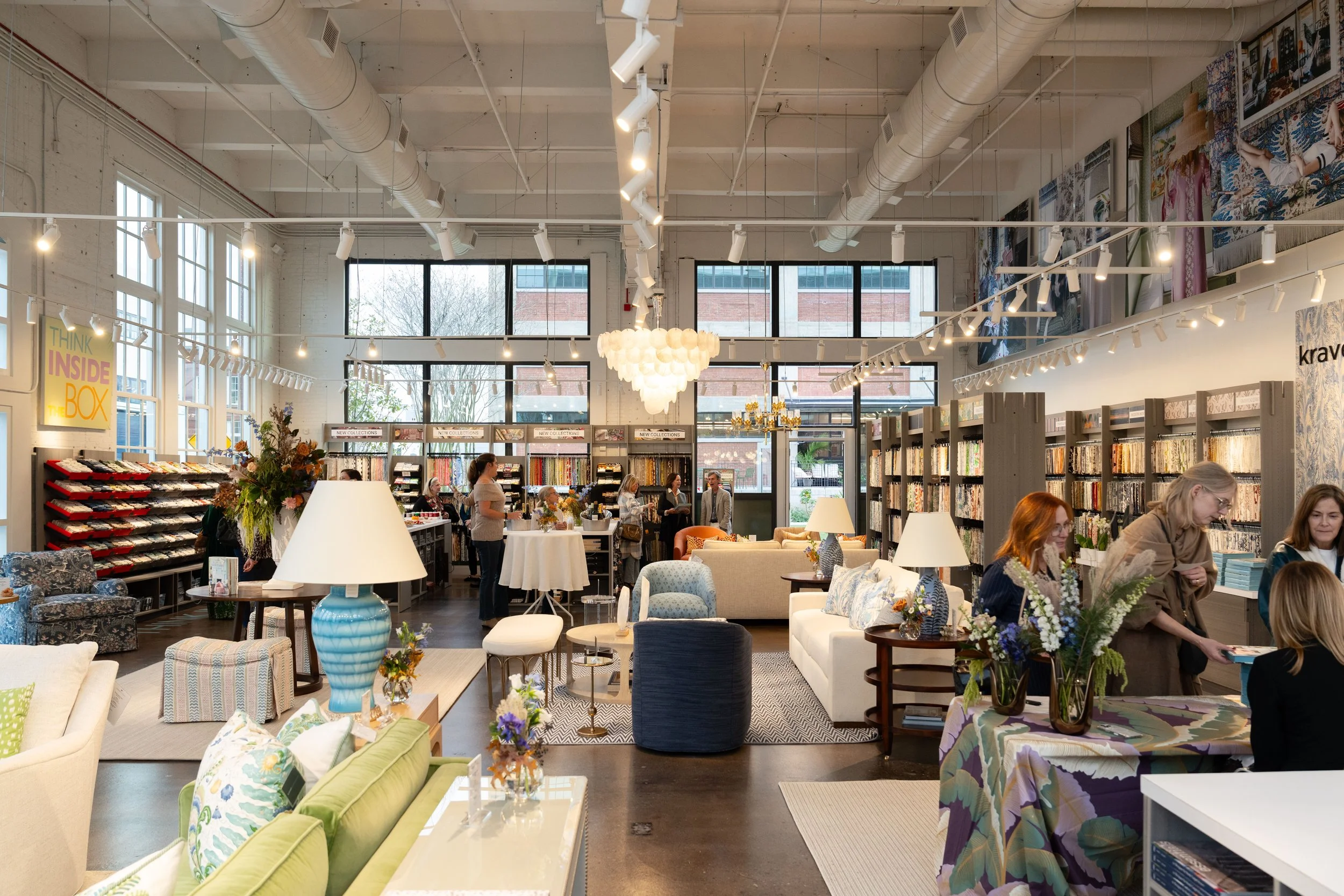 Boutique trade showroom specializing in textiles, wallpaper, lampshades, and custom furniture/rugs from around the world.